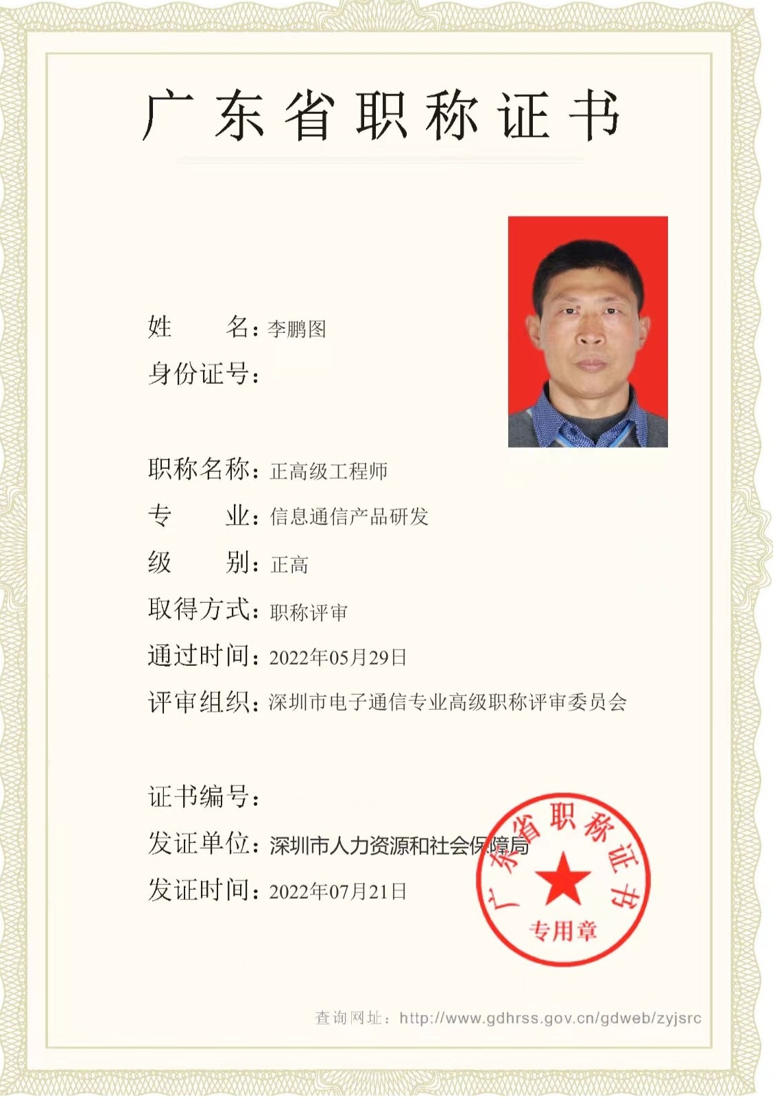 5月30日,我司總經(jīng)理李鵬圖榮獲廣東省信息通信產(chǎn)品研發(fā)專業(yè)正高級職稱。