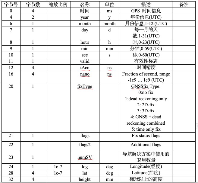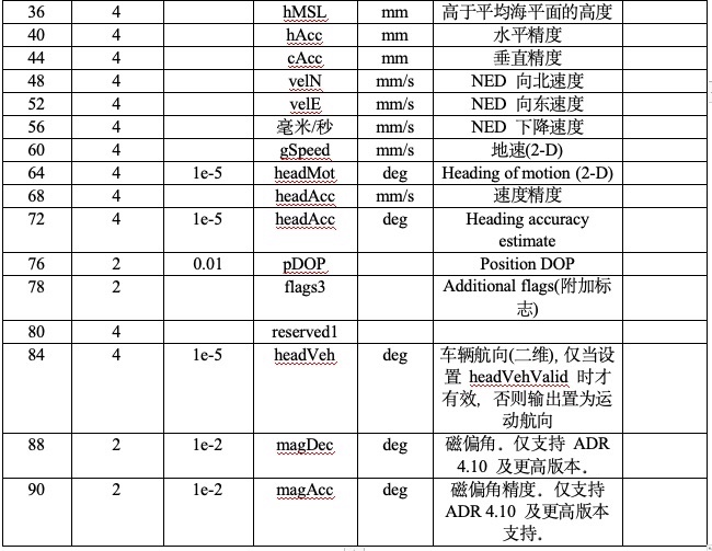 該消息結(jié)合了位置、速度和時間解決方案,包括精度數(shù)字。協(xié)議輸出有效信息如下表格: